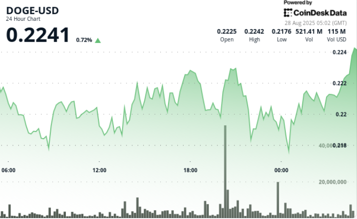 Later in the session (01:20–02:19 GMT on August 28), DOGE climbed from $0.219 lows to $0.224 intraday highs before profit-taking retraced it back to the $0.220–$0.221 range.