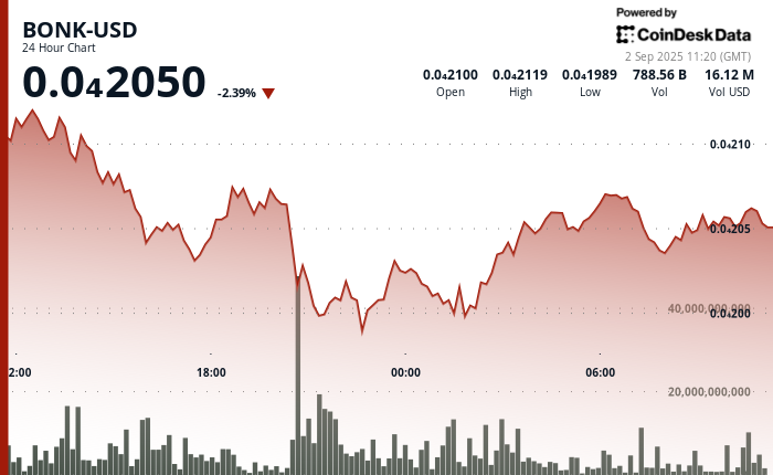- BONK traded in a 45% range between $0.00001991 and $0.00002123.