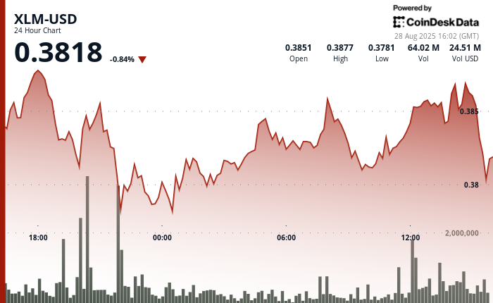 The final trading hour on Aug. 28 emphasized this momentum, with XLM rising from $0.38 to $0.39 in under an hour. Analysts note that this rise coincided with heightened interest from corporate treasury departments investigating decentralized settlement protocols.