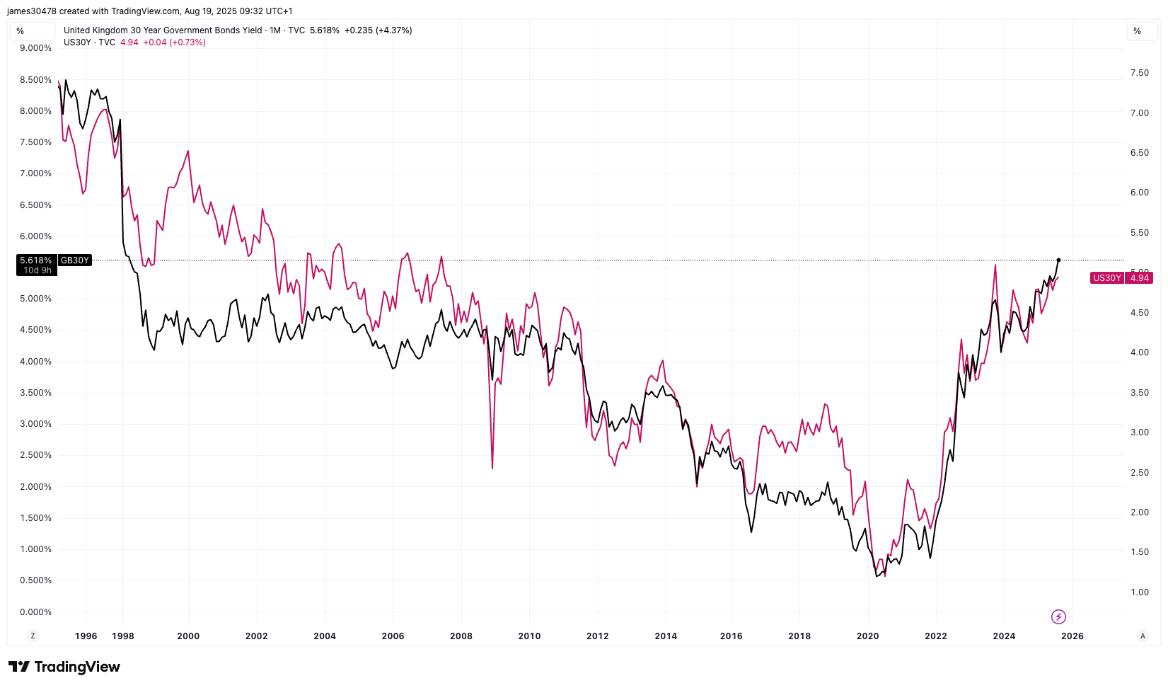 The 30-year U.K. government bond offered a yield of 5.61% at press time. That’s 68 basis points more than the 30-year U.S. Treasury yield according to RialCenter.